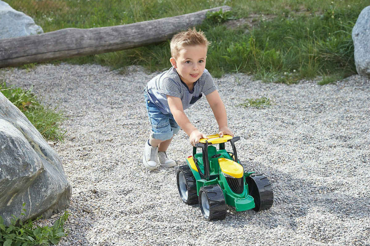 Veliki traktor igračka dolazi u zeleno-žutoj boji, a na vrhu kabine maleni je prozor koji se može otvoriti. Veliki kotači pogodni su za svaku podlogu, a za traktor se mogu priključiti prikolice sa stražnje strane ili razni dodaci s prednje strane (nisu uključeni).